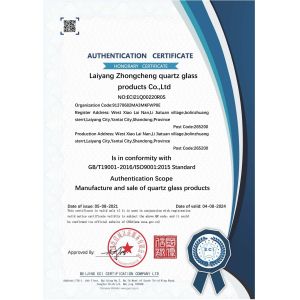 Beijing Zhong Cheng Quartz Glass Co., Ltd (ZCQ) has passed ISO9001:2015 quality management system certification and SGS product testing certification; conducts technical training service, micro-structure analysis and quartz characteristic testing project once a year; invites the professor from the Chinese Building Materials Academy for technical support from time to time.